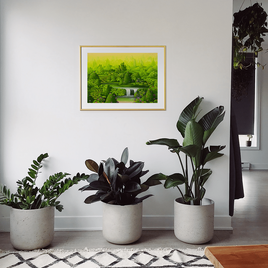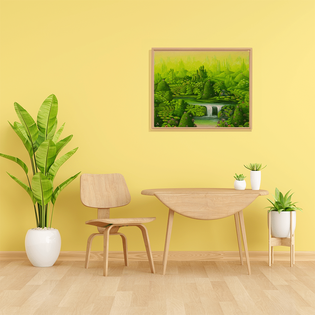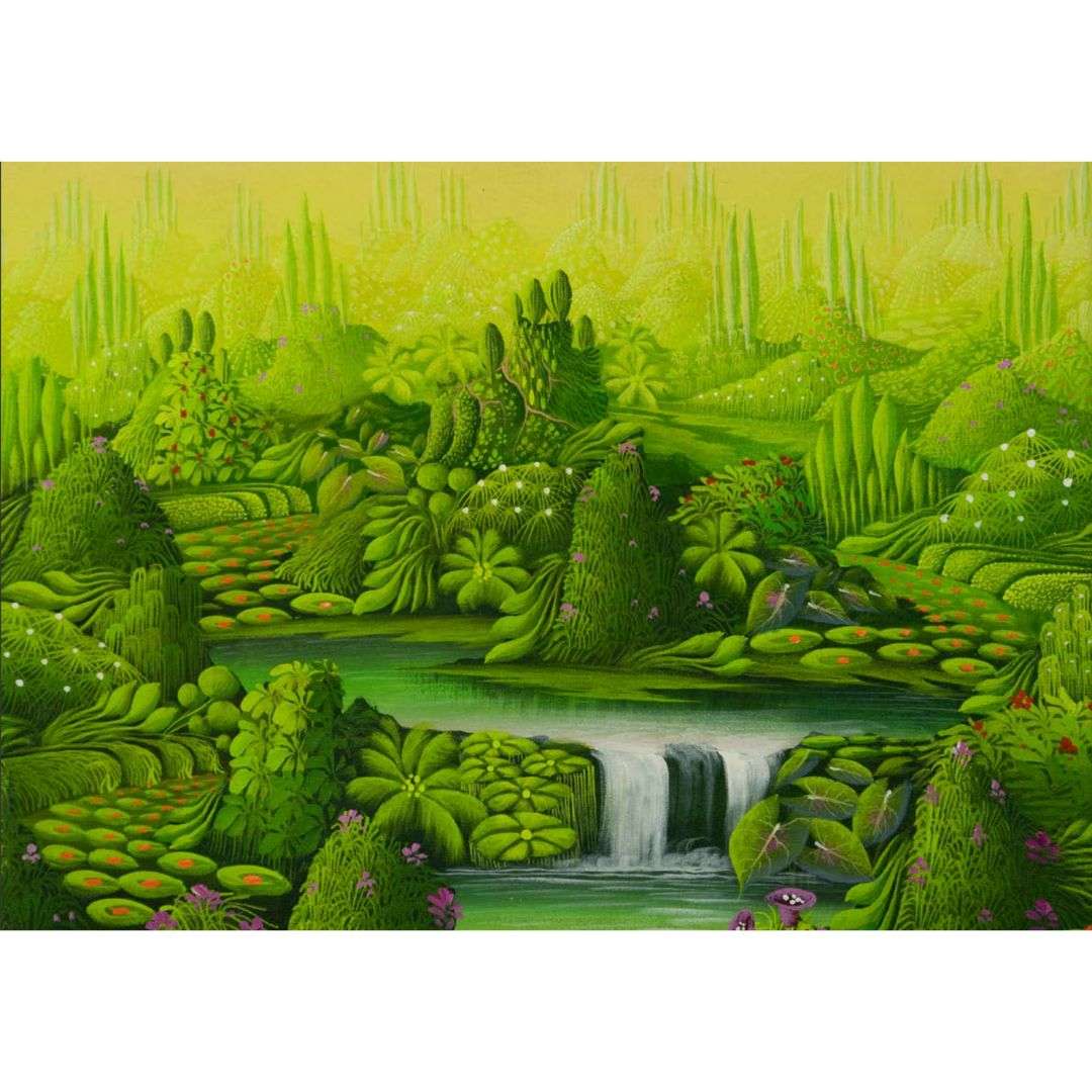 Lily Honson, with her piece "Dream of the Haitises," an acrylic on canvas measuring 55 cm by 44 cm, invites us to delve into a surreal landscape where nature is the undisputed protagonist. The composition, filled with shades of green and luminous sparkles, seems to throb with the energy of a mystical plant world. Organic shapes intertwine creating a tapestry that celebrates the diversity of tropical flora. The waterfall at the center of the work adds a sense of movement and freshness, while the detailed textures invite the viewer to explore every corner of this earthly paradise. Honson succeeds in transporting the viewer to the Haitises, interpreting these magical domains with a vision that is both a window to an imaginary world and an echo of the real landscapes of Haiti.