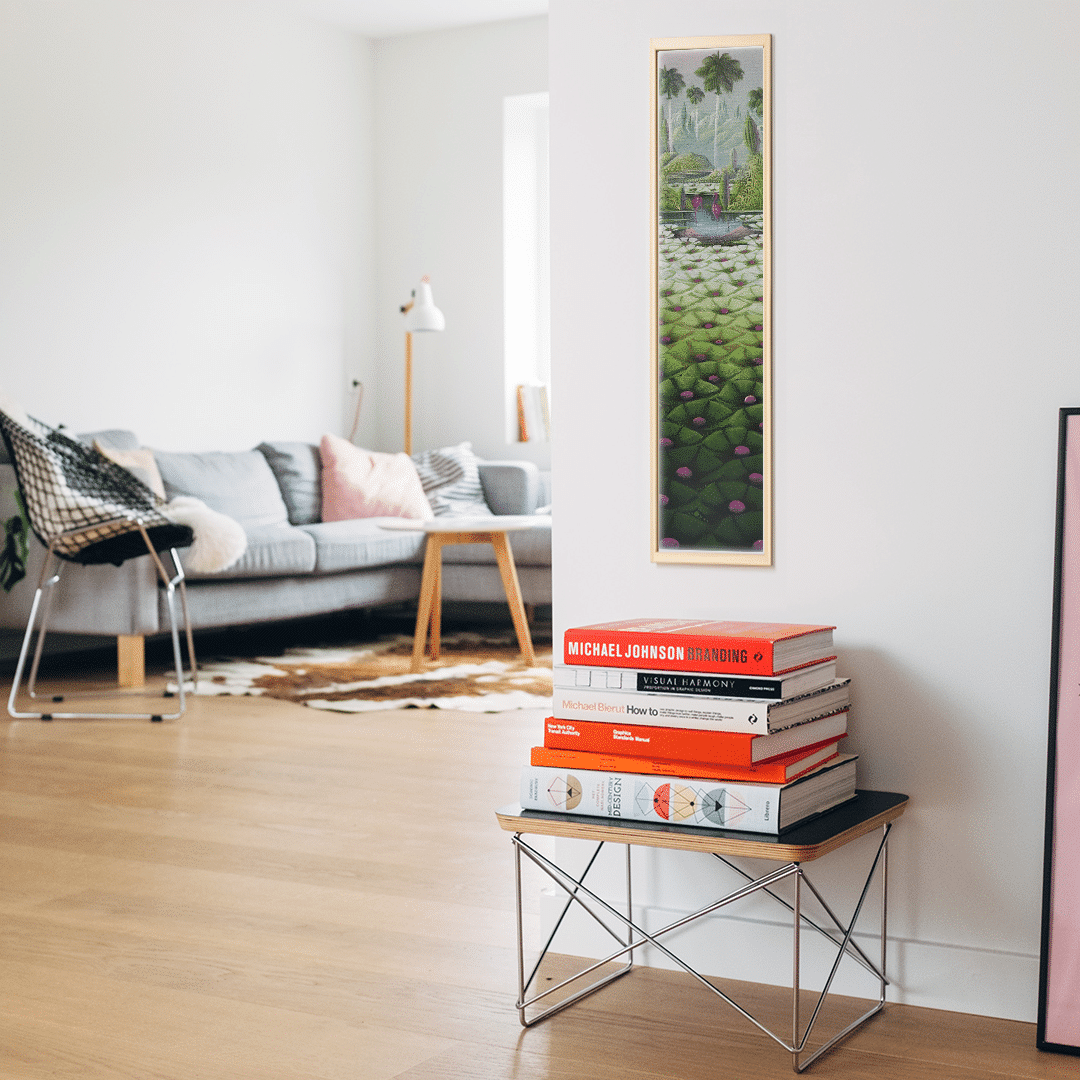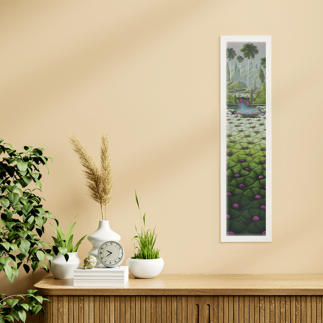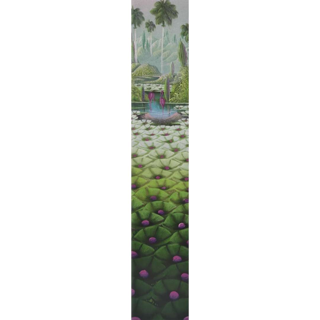 Lily Honson's "Dreaming in the Countryside" is a stylized and serene vision of nature, measuring 73.5 cm x 18 cm in acrylic on canvas. This vertical composition takes us on a bucolic escape where the symmetry of lily pads in the foreground blends with a tranquil dance of flamingos under distant palm trees. The color palette is soft and harmonious, inviting calmness and meditation. The reflection on the water acts as a mirror, doubling the beauty of the birds and vegetation, creating a sense of depth and expansion. Honson offers us a poetic portrait of the countryside, where meticulous details and the rhythmic repetition of forms suggest a lucid dream, a moment suspended in the stillness of an earthly paradise.