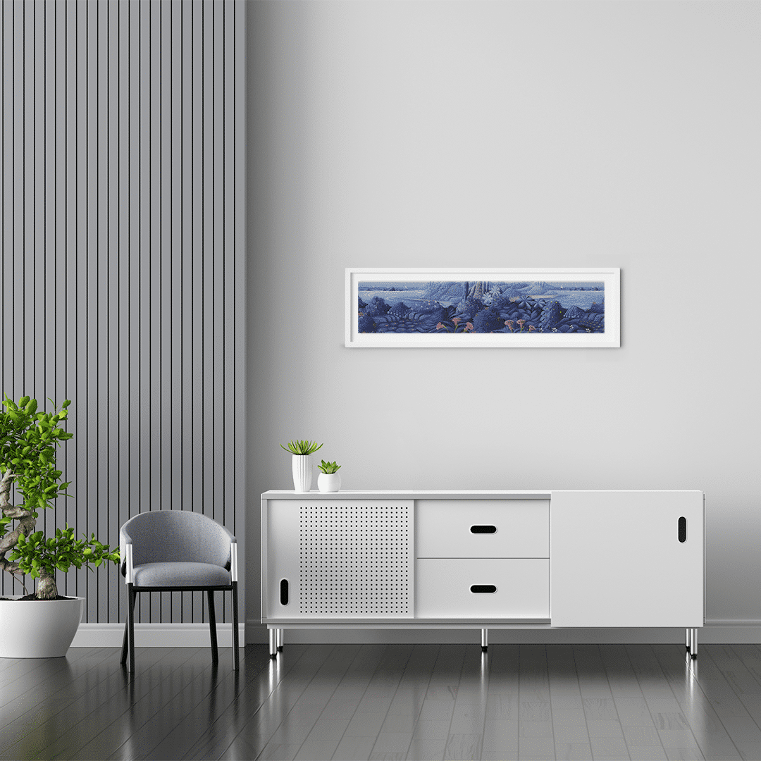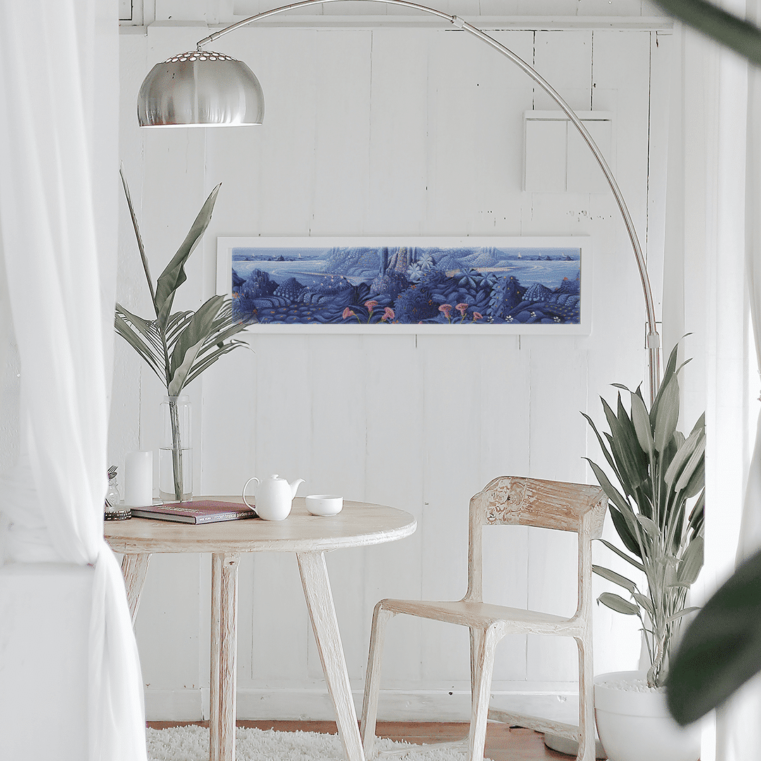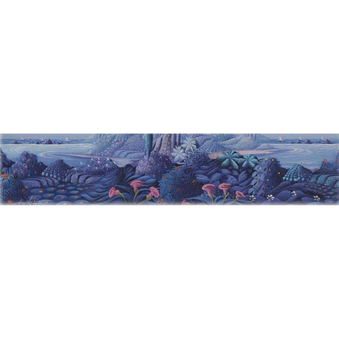 "Flores del Paraíso" ("Flowers of Paradise") by Lily Honson, measuring 73.5 cm by 18 cm, is an acrylic painting that immerses us in a dreamlike panorama of tropical flora in the stillness of the night. The contrast of cool tones in the nocturnal foliage with the warm lights emerging from flowers and plants creates an atmosphere of mystery and allure. The seascape background, with distant ships and the soft glow of the moon reflected on the water, introduces a feeling of vastness and tranquility. This scene, blending elements of the marine and terrestrial landscape, becomes a dreamscape where reality merges with fantasy. Honson captures the magic of nature, transforming the everyday into a spectacle of color and texture that invites contemplation and wonder.