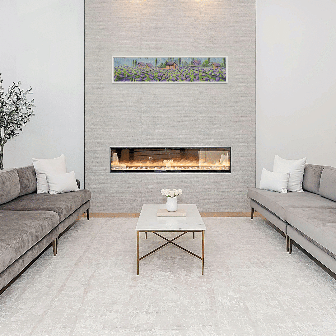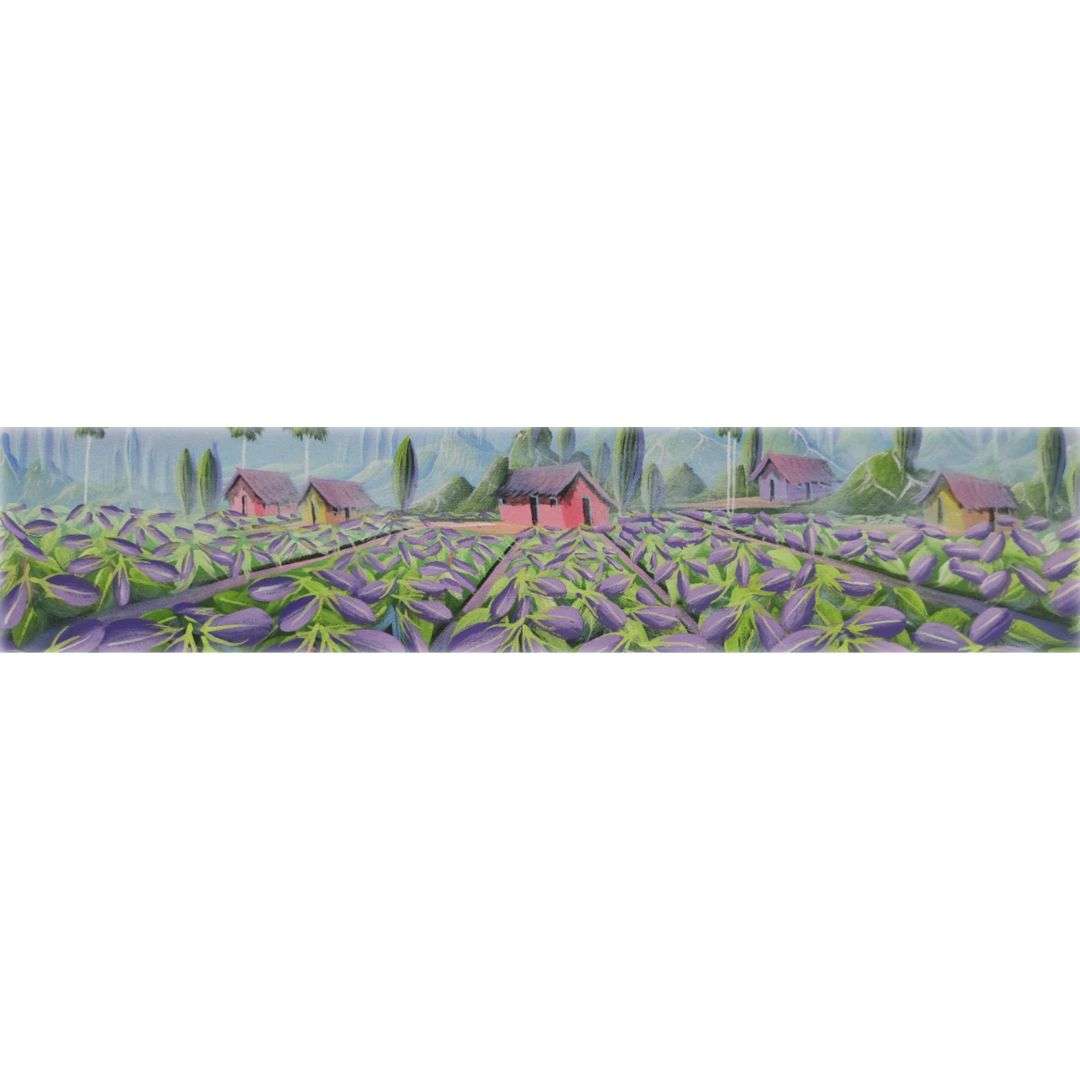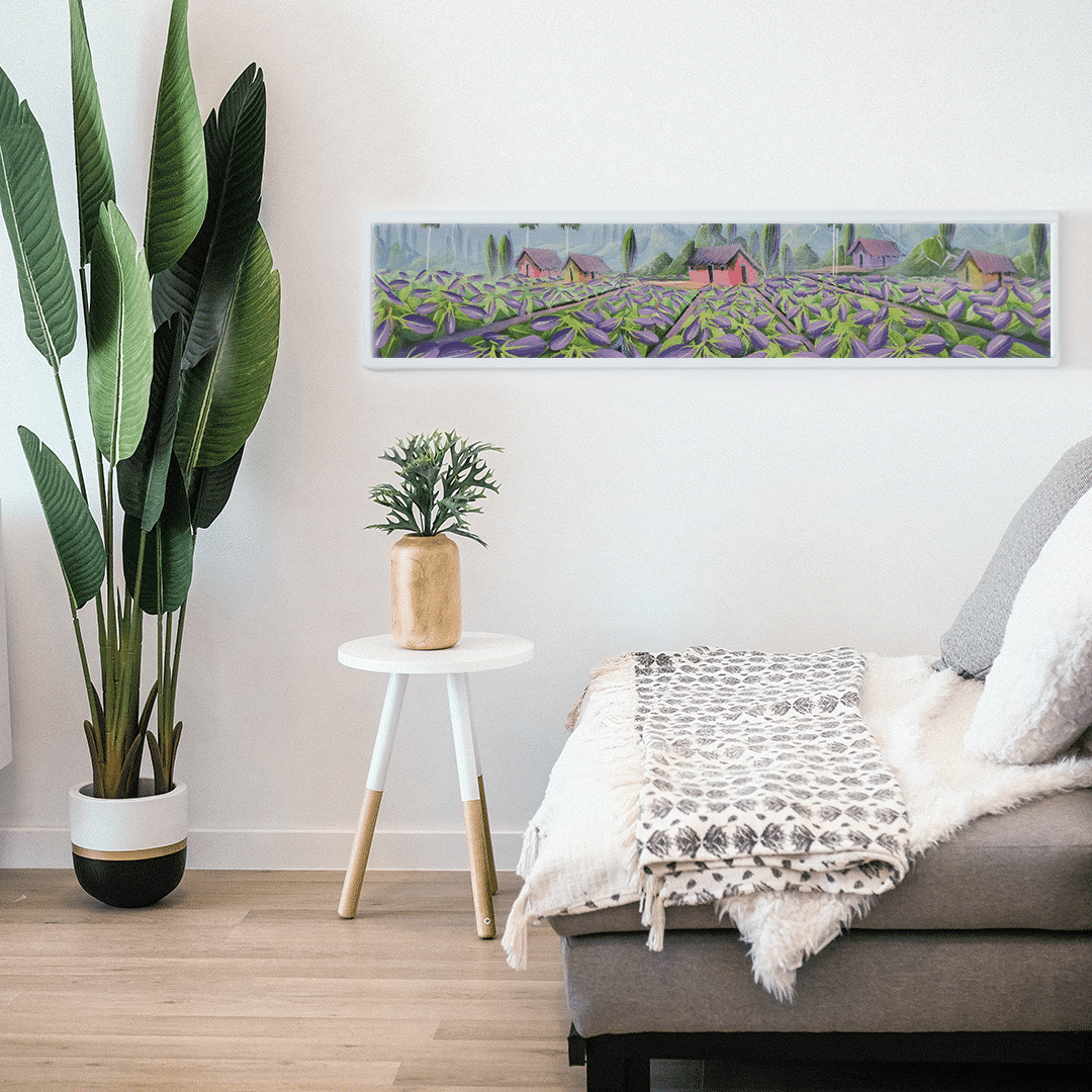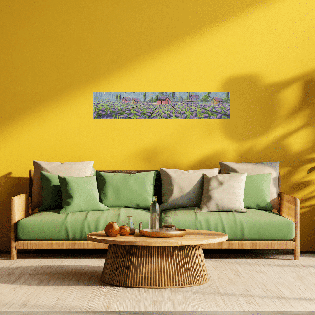 "Violet Inspiration" is a delightful work by Lily Honson, stretching out in a panoramic format of 73.5 cm by 18 cm. This acrylic captures the mesmerizing beauty of a field of violet flowers, whose purple hues paint a canvas of tranquility and reverie. The small houses scattered in the distance offer a rustic contrast to the delicacy of the flowers, suggesting a harmonious coexistence between humanity and nature. Light seems to dance on the petals and leaves, creating a play of light and shadow that invites the viewer to immerse themselves in the stillness of the moment. Honson distills in this work the essence of tranquil afternoons in the countryside, where time stands still and the simple beauty of nature speaks to the soul.