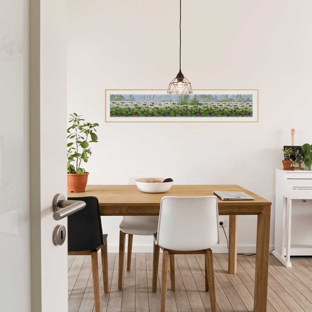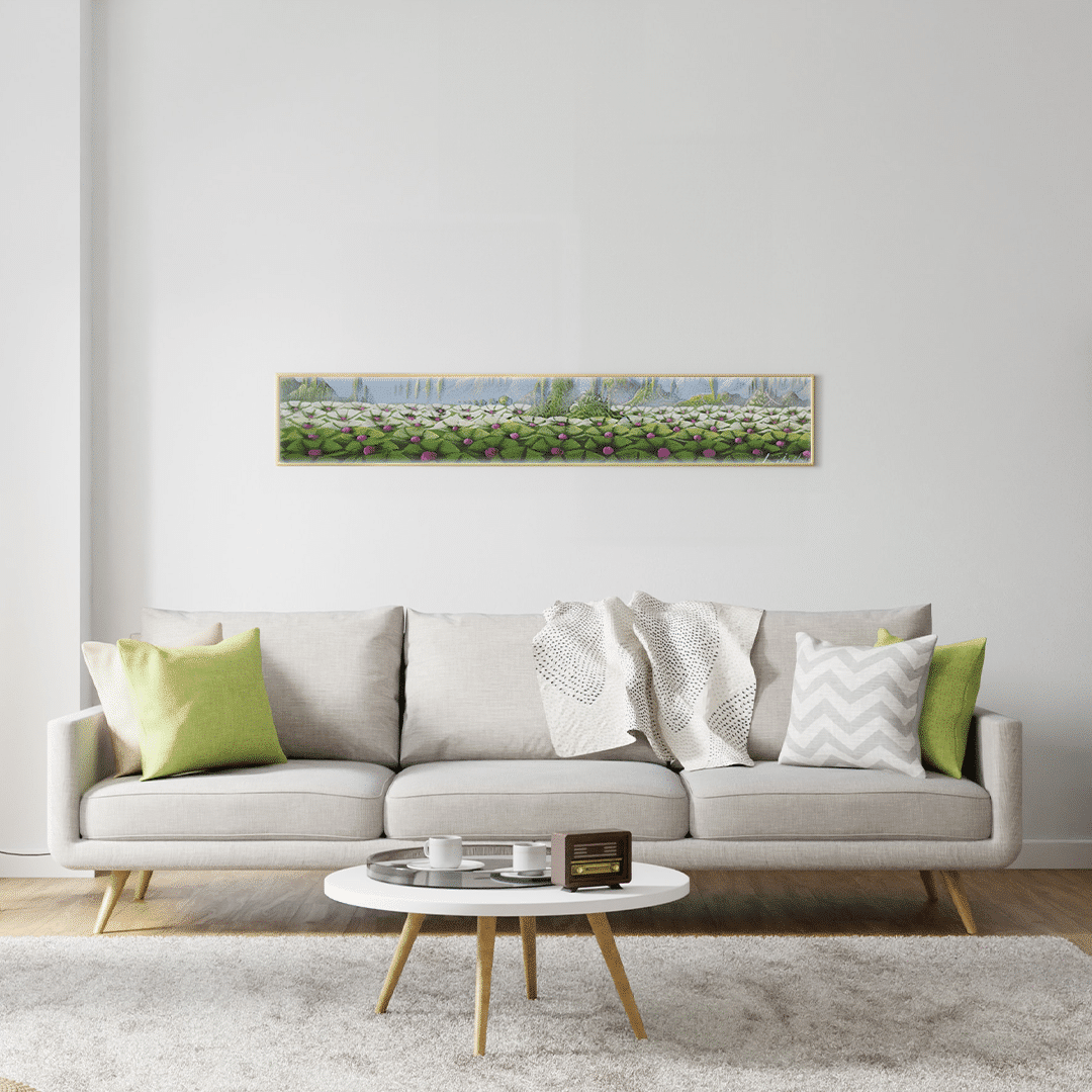 Lily Honson nos presenta "Sueños tropicales", una obra acrílica estrecha pero expansiva de 73,5 cm x 13,5 cm. Despliega un tapiz de hojas verdes y flores de loto que parecen flotar sobre aguas tranquilas. La perspectiva alargada nos lleva en un viaje visual a través de un paisaje exuberante, donde la frescura de las hojas y la delicadeza de las flores evocan la serenidad de los jardines tropicales. Las montañas lejanas y la suave bruma añaden profundidad y misterio a la escena, invitando a la contemplación. La técnica de Honson capta hábilmente la luz y la sombra, haciendo que cada pétalo y cada hoja palpiten de vida. Este paisaje es más que un lugar físico; es un estado de ánimo, un refugio para el espíritu que busca la calma y la belleza natural.