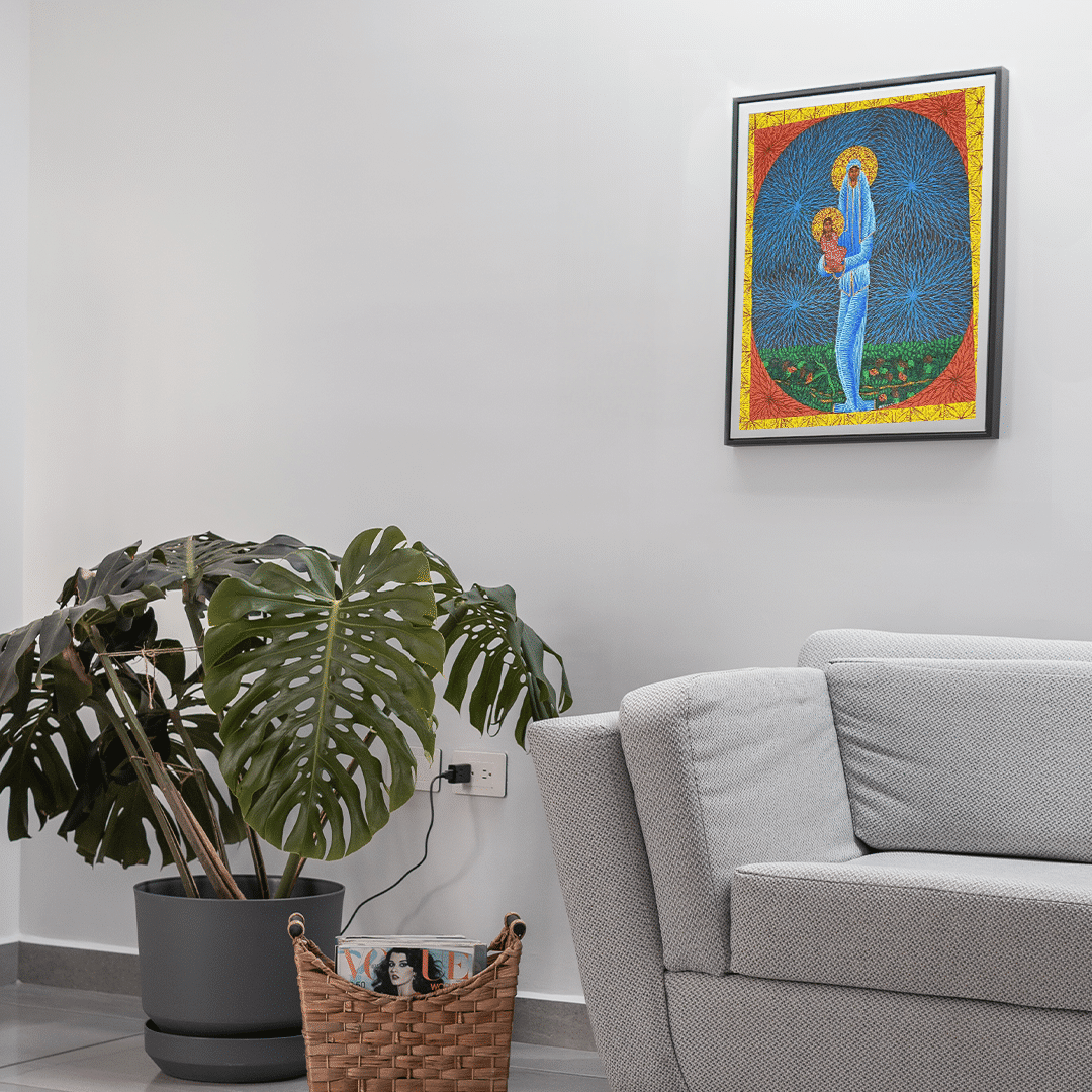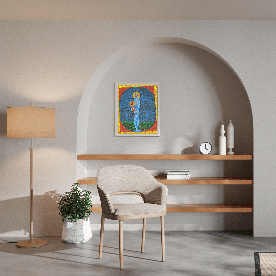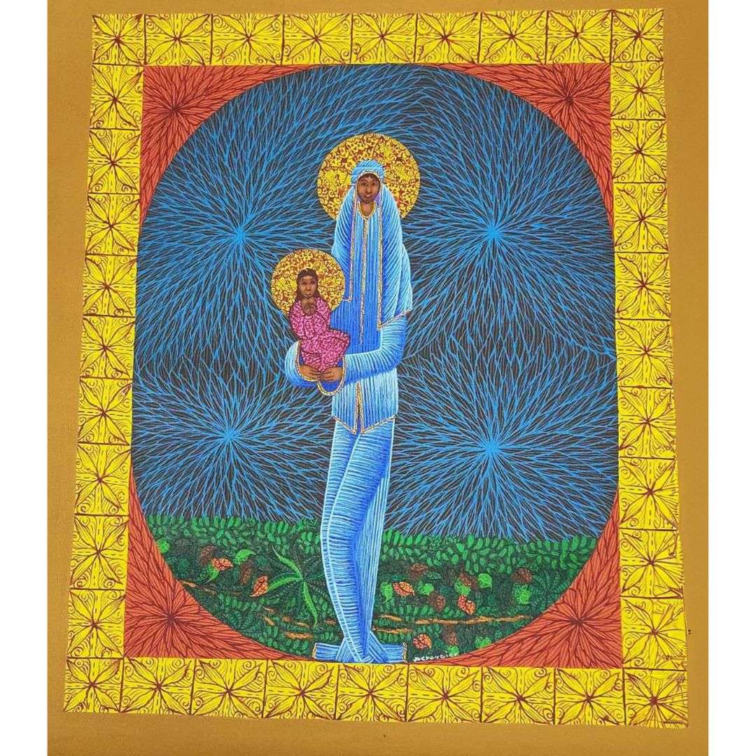 En esta obra, Dérossier hace gala de su maestría en el arte naïf caribeño, presentándonos una representación de la Virgen con el Niño que resplandece de vitalidad espiritual y calidez tropical. Los halos dorados destacan sobre un fondo azul profundo que parece no tener fin, sugiriendo una conexión celestial. Vestida con tonos azules puros, la Virgen sostiene al Niño con una serenidad que transmite una profunda paz. A sus pies, la naturaleza florece en alusión a la vida y la esperanza nacidas de la maternidad. La textura y el vibrante colorido del fondo contrastan con la serena composición de las figuras, creando un aura que parece moverse en ondas a su alrededor. El borde que rodea la escena está adornado con motivos que evocan el rico patrimonio cultural del Caribe, añadiendo una dimensión de identidad y pertenencia.